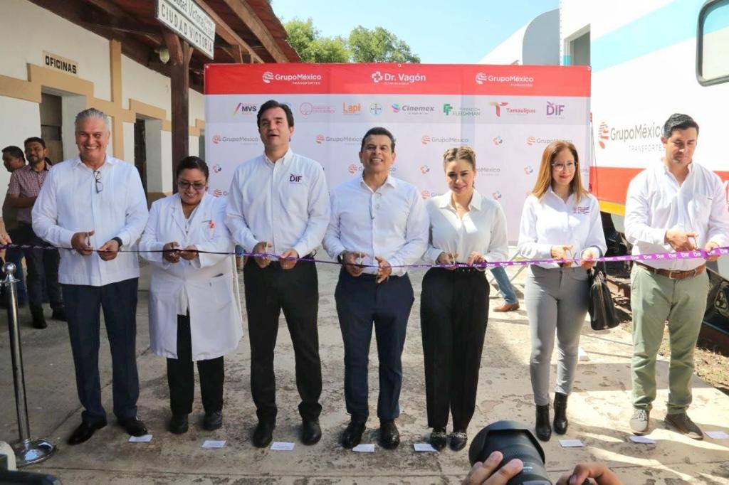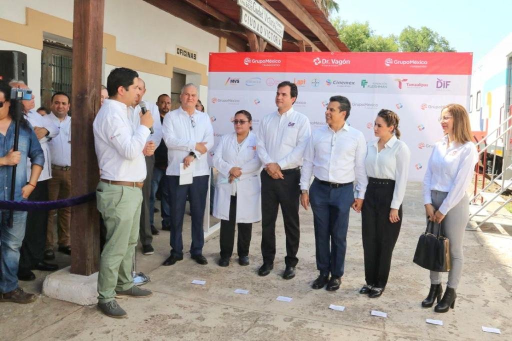 Cd. Victoria, Tamps., 13 de septiembre. – Con apoyo del Sistema DIF Tamaulipas que preside la Dra. María de Villarreal y del gobernador Américo Villarreal Anaya llegó a Victoria el tren de la salud “Dr. Vagón”, acto en el que el alcalde Eduardo Gattás Báez agradeció la labor humanitaria que viene a realizar en favor de las familias victorenses.