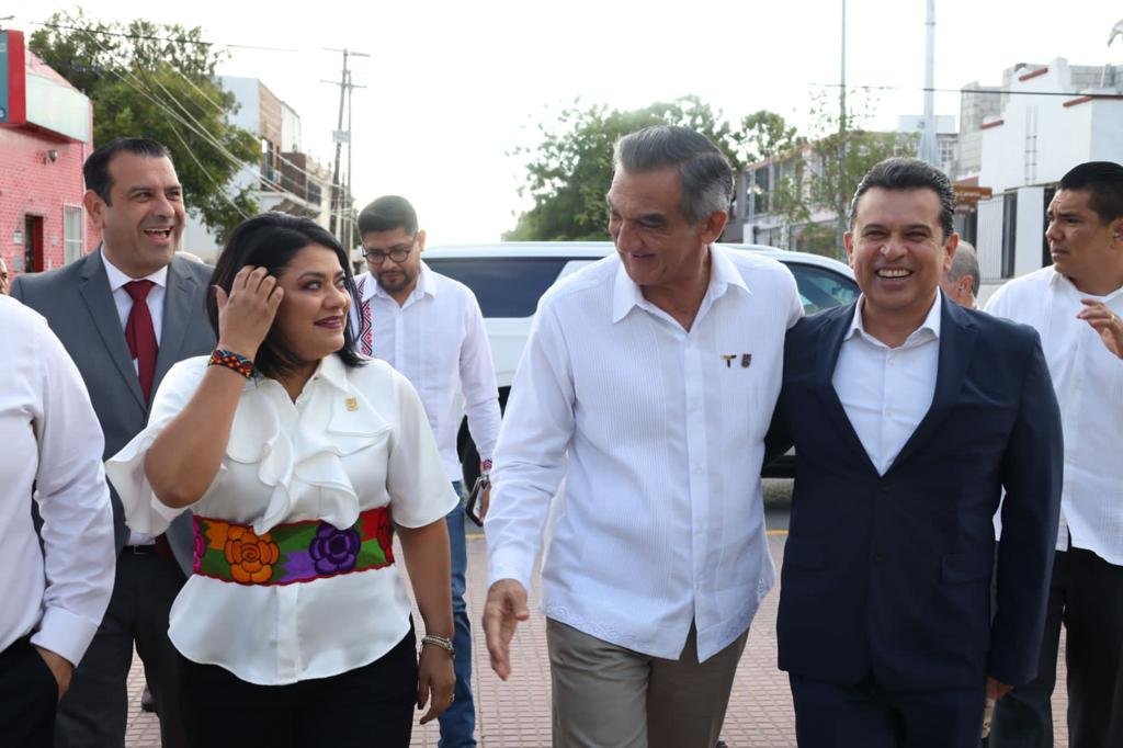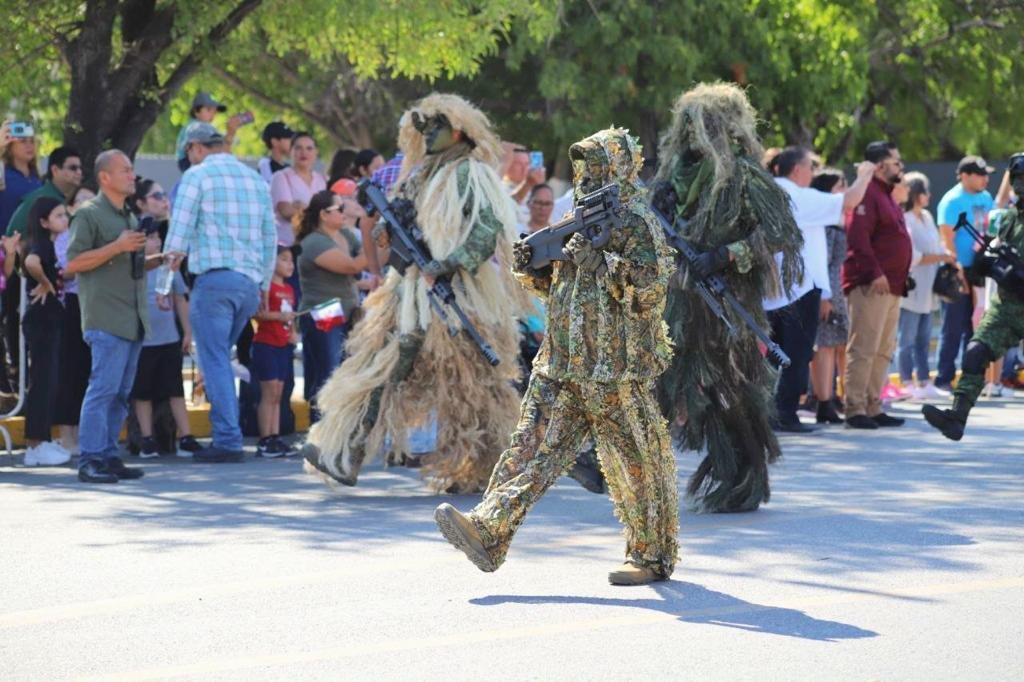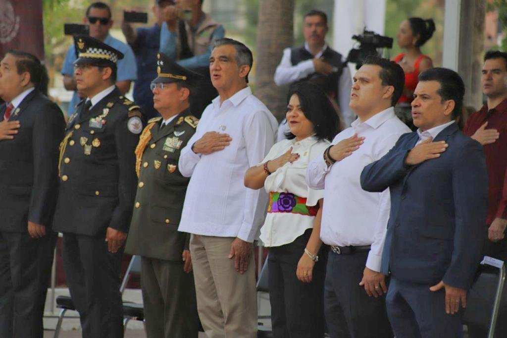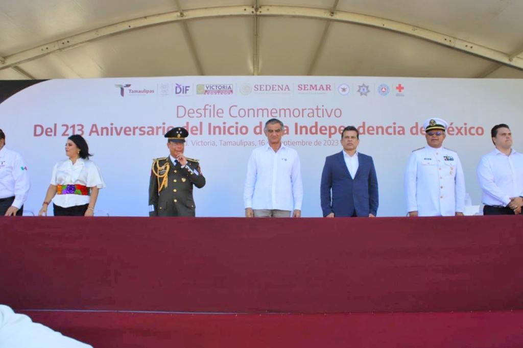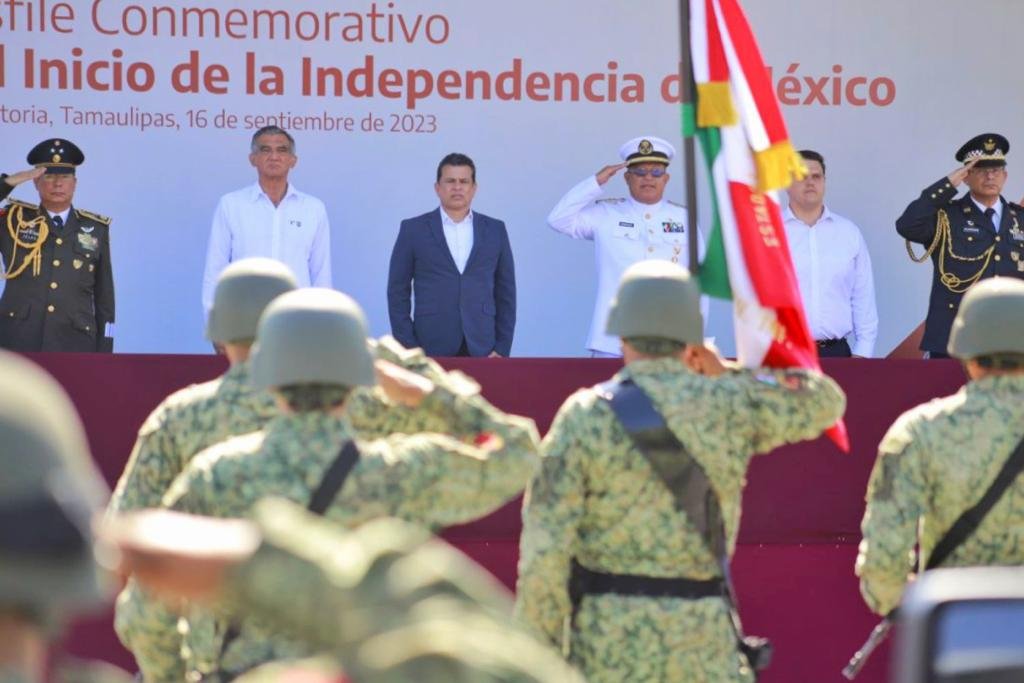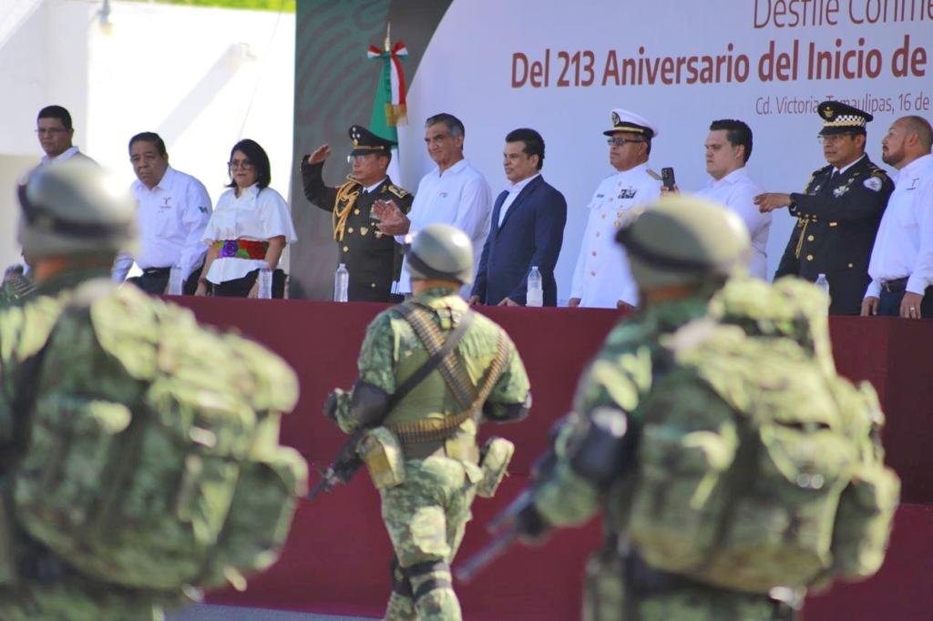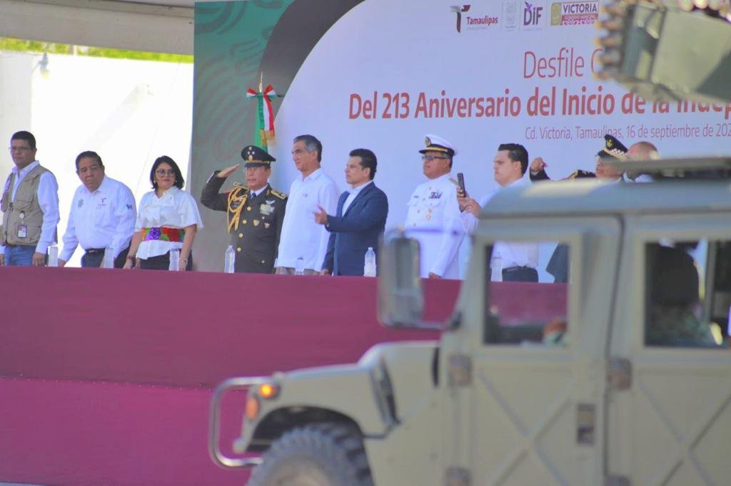 Posteriormente, se trasladaron al templete dónde presenciaron el desfile cívico militar sobre el boulevard Tamaulipas, en el que participaron elementos de SEDENA, Guardia Nacional, Guardia Estatal, Cruz Roja y Protección Civil.