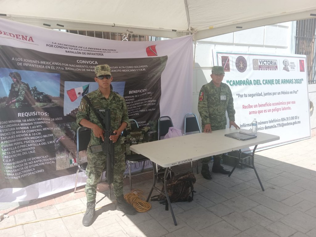 Por acuerdo de la Mesa de Seguridad Municipal, el módulo de atención fue reinstalado frente al edificio del Ayuntamiento de Victoria, donde personal militar recibe de manera anónima y sin consecuencia legal armas y municiones a cambio de un beneficio económico.