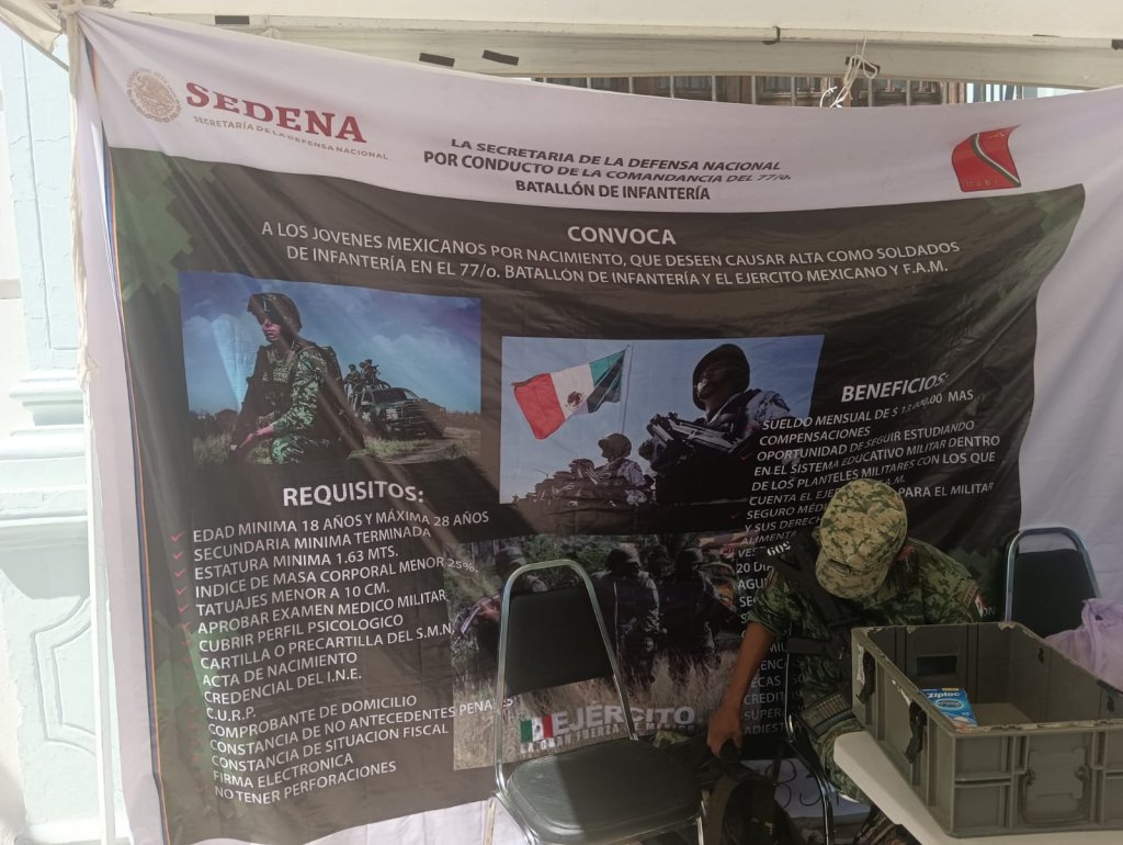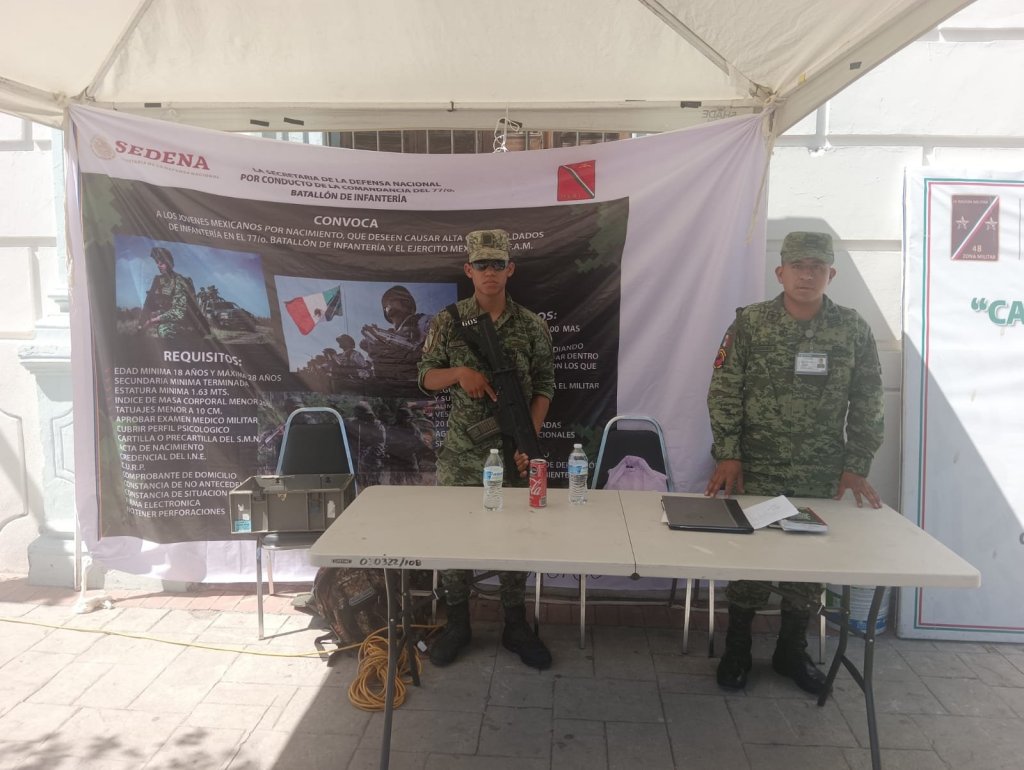 De manera alterna, La Secretaría de la Defensa Nacional, mantiene abierta la convocatoria para jóvenes mexicanos que deseen causar alta como soldados de infantería en el 77/o Batallón de Infantería y Ejercito Mexicano, brindando información a los interesados en el mismo módulo.