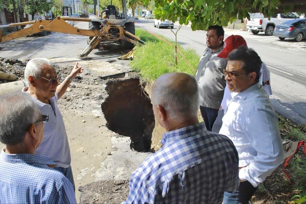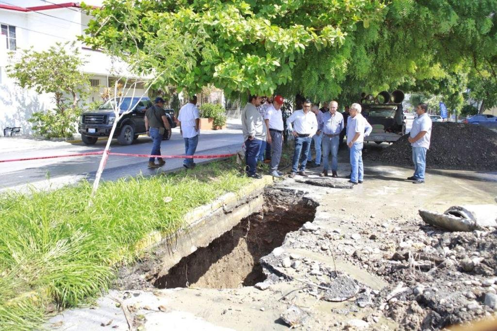 Cd. Victoria, Tamps., 14 de octubre. – Este sábado, el alcalde Eduardo Gattás Báez realizó un recorrido de supervisión en el socavón que se produjo en la avenida del 15 Michoacán, de la colonia Magisterial, por la ruptura de una línea tubular de drenaje.