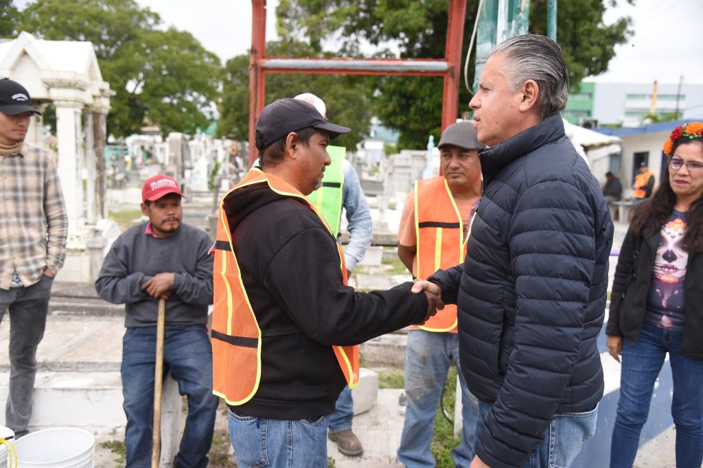 Al efectuar un recorrido por los diferentes panteones municipales de Tampico, el Alcalde Chucho Nader supervisó los operativos de limpieza y vigilancia que desarrollan elementos de las Secretarías de Servicios Públicos, y de Tránsito y Vialidad, para garantizar el orden y limpieza al interior de los camposantos, así como la protección vial de los visitantes.