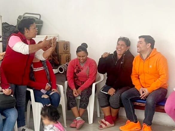 Entre saludos y pláticas, las líderes de colonias le ofrecen al precandidato buñuelos, café y distintas meriendas, conviviendo y disfrutando de momentos en familia.
