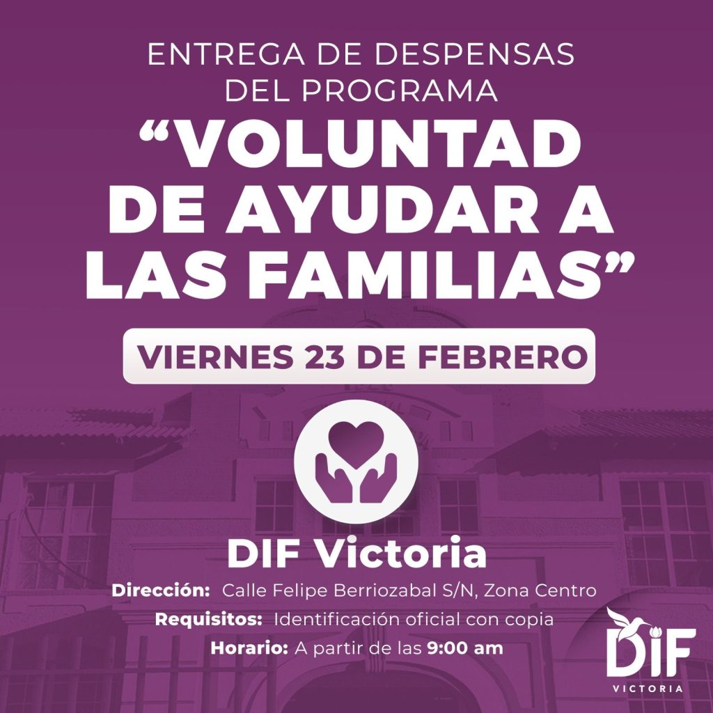 Ciudad Victoria, Tamaulipas 22 de febrero del 2024 – Como parte de las acciones contempladas en el programa alimentario del DIF Victoria en coordinación con el DIF Tamaulipas, se realizará la entrega de despensas de la iniciativa “Voluntad de Ayudar a las Familias” la cual consiste en una entrega trimestral de dotación alimenticia a las familias en situación de vulnerabilidad en el Estado de Tamaulipas.