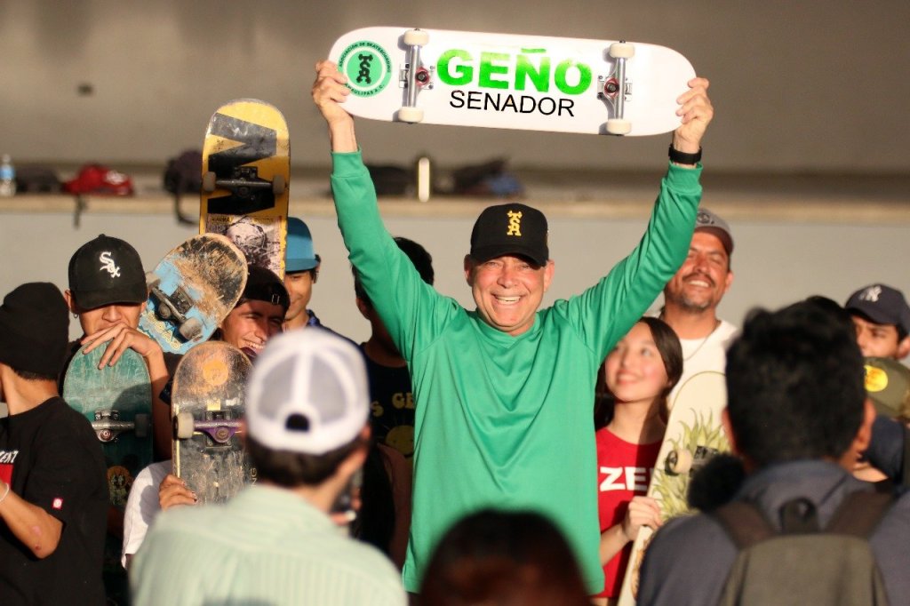 Victoria.- A bordo de una patineta y mostrando sus destrezas de equilibrio sobre la tabla, Eugenio «Geño» Hernández Flores convivió con jóvenes que integran la Asociación de Skateboarding de Tamaulipas, ahí les garantizó que será su voz en el Senado.