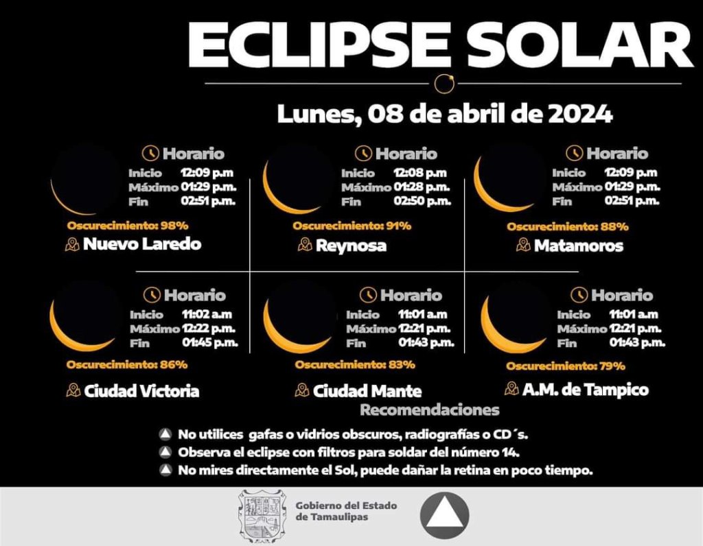 El próximo lunes, 08 de abril será el Eclipse Solar, su totalidad se observará en ciudades como Mazatlán, Durango, Torreón, Monclova y Piedras Negras. En Tamaulipas se apreciará de forma parcial con un oscurecimiento del 79 a 98% del disco solar.