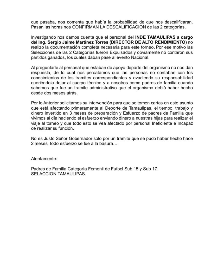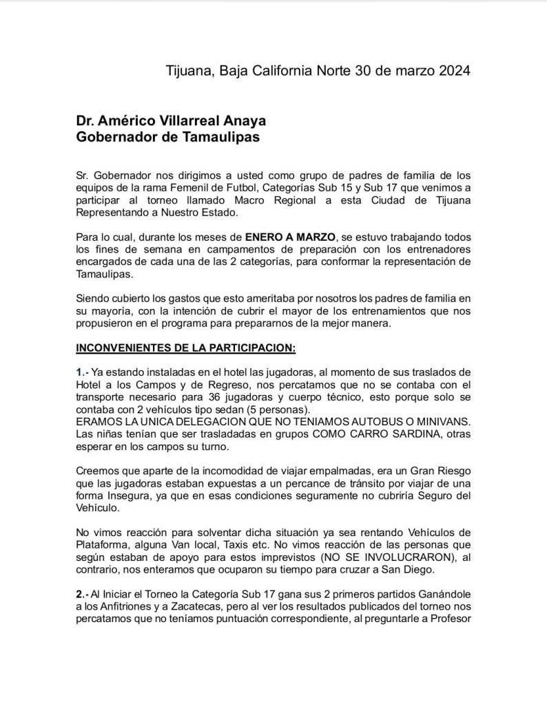 Padres de Familia de las Categorías Sub 15 y Sub 17 de la Rama Femenil de Futbol, piden la intervención del Gobernador Américo Villareal, ya que exponen que desde un inicio notaron la falta de atención hacia la Selección Tamaulipeca.