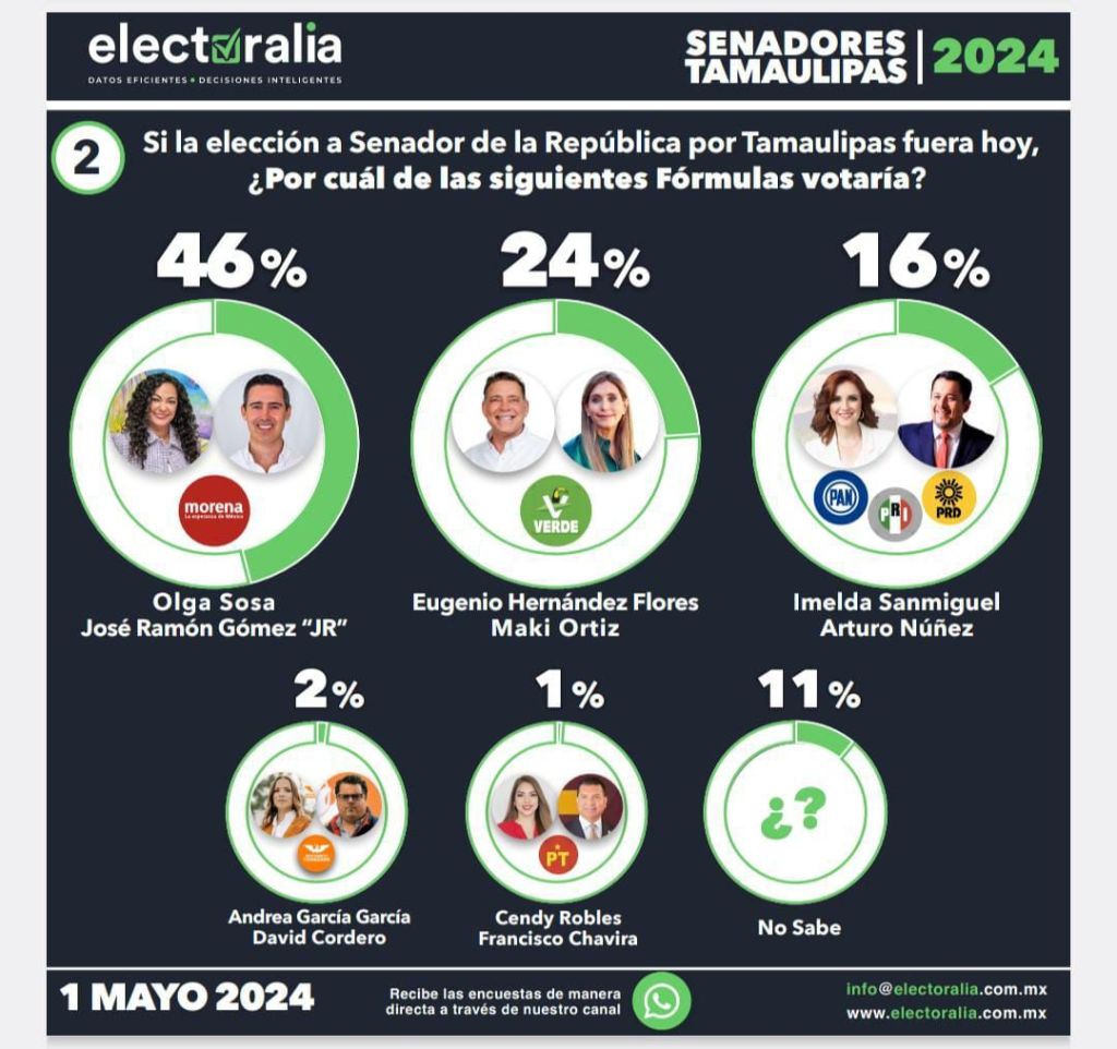 Mientras que en la pregunta, si la elección a Senador de la República por Tamaulipas fuera hoy, ¿por cuál de las siguientes fórmulas votaría?, el 46 por ciento señaló que la conformada por Olga Sosa y José Ramón Gómez; el 24 por ciento por que conforman Eugenio Hernández y Maki Ortiz, mientras que un 16 por ciento dijo que la formada por Imelda Sanmiguel y Arturo Núñez.