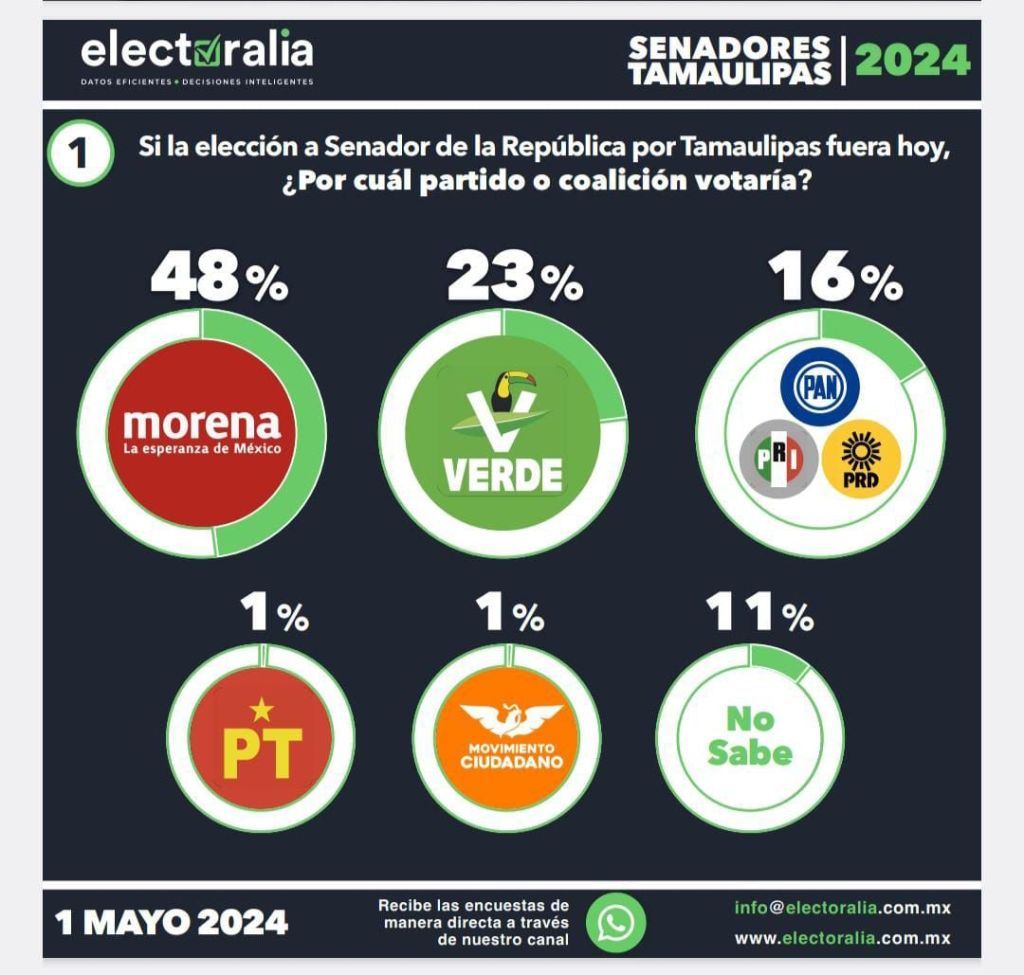 A la pregunta de ¿si la elección a Senador de la República por Tamaulipas fuera hoy, por cuál partido o coalición votaría?, el 48 por ciento se decantó por Morena, 23 por ciento por el Partido Verde, mientras que la coalición del PAN-PRI-PRD alcanzan apenas el 16 por ciento, uno por ciento el PT, uno por ciento Movimiento Ciudadano y el 11 por ciento aún no sabe.