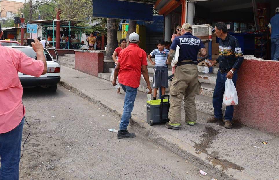 Paramédicos y personal de bomberos recorrieron del 6 al 8 boulevard Praxedis Balboa para ofrecer raciones de agua fresca a niños, jóvenes y adultos para evitar afectación en su salud por los 41 grados centígrados, con sensación térmica de 43, que registran en la Capital del Estado.