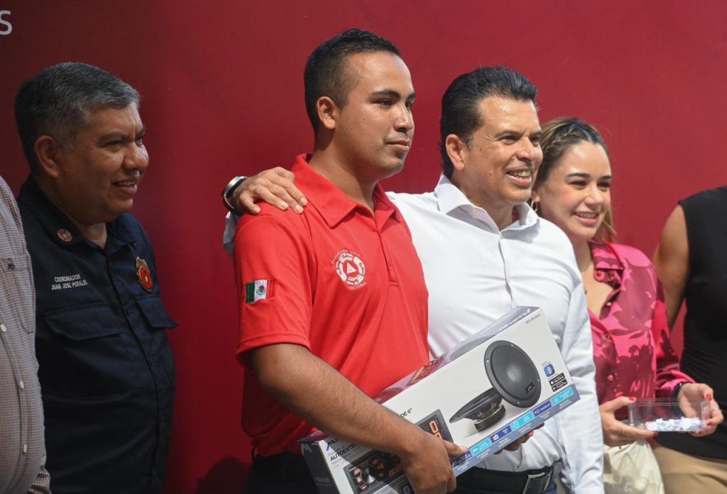 Durante la celebración, en la que estuvo acompañado de la presidenta del DIF Municipal Lucy de Gattás, entregó una unidad de rescate y herramienta para dignificar su labor, con el compromiso de dotar en los próximos meses de 80 equipos más de protección contra incendios.