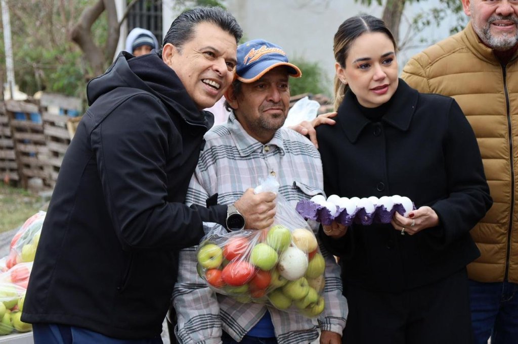 En compañía de sus equipos de trabajo, acudieron este jueves por la mañana a la colonia Villas de Guadalupe, donde entregaron 150 dotaciones más de fruta, verdura y huevo a habitantes reunidos frente al domicilio de la señora Josefina Salinas.