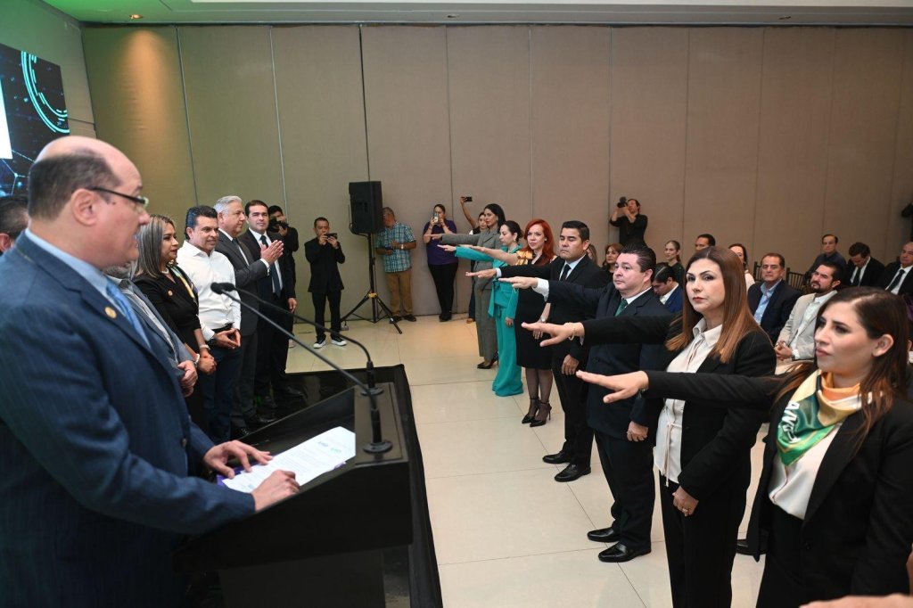 “Ustedes son quienes conectan a las familias con sus hogares, a las empresas con sus espacios de trabajo, y a toda la comunidad con oportunidades” dijo ante la vicepresidenta ejecutiva nacional de la asociación Jenny Altair Rivas Padilla y Armando de la Cruz, director del Registro Catastral del Estado.
