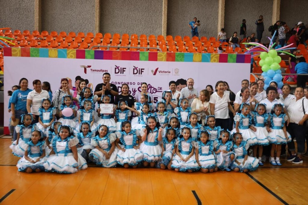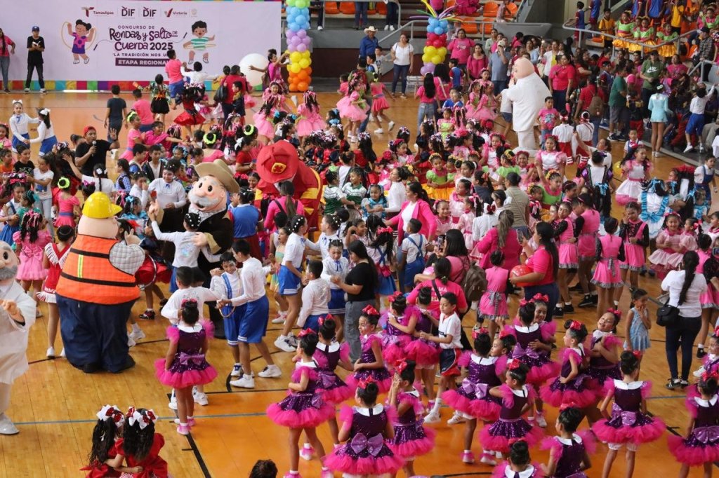 Cd. Victoria, 3 de abril 2025. – Con espectacular exhibición de coreografías de alumnas y alumnos de instituciones educativas de 13 municipios, se celebró el Concurso de Rondas y Salto de Cuerda 2025 que fue presidido por la presidenta del DIF Municipal Lucy de Gattás y el alcalde de Victoria Eduardo Gattás Báez.