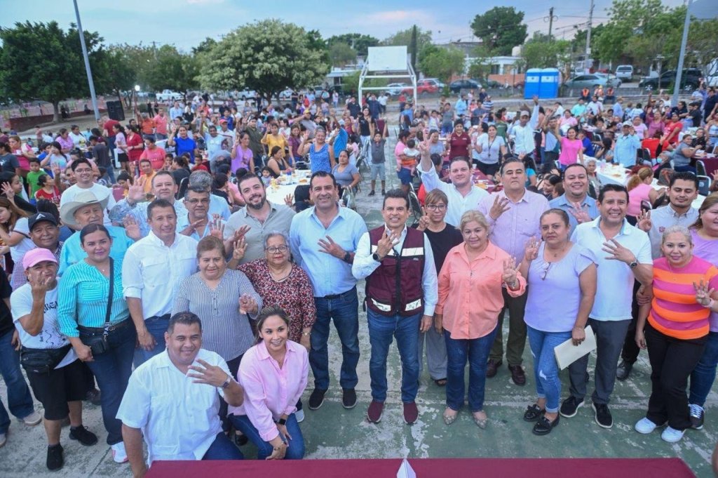 Acompañado de integrantes del Gabinete y Cabildo Municipal, arribó al área deportiva del sector donde fue recibido por más de 400 mujeres, jefes de familia, jóvenes y niños con los que compartió bocadillos, bebidas de sabor, helados, juego de lotería, la rifa de tinacos y atención personalizada en la mesa de audiencia pública.