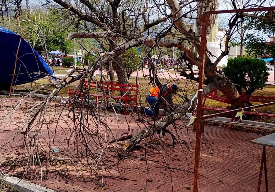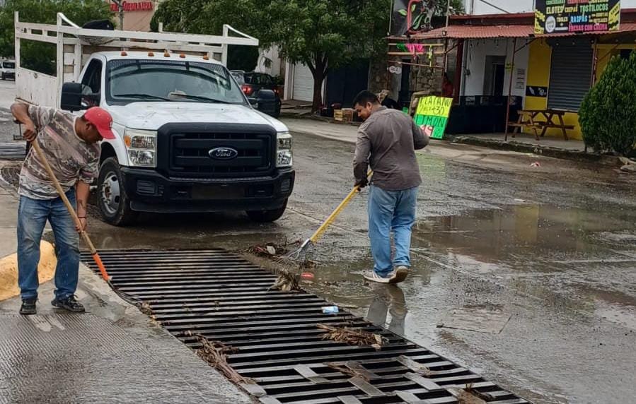 Cuadrillas de trabajadores recorren distintos sectores para restaurar el daño ocasionado por el paso del frente frío número 42 que, con fuertes ráfagas de viento e intensa lluvia, ocasionó la noche de este jueves inundaciones mínimas en algunas vialidades.