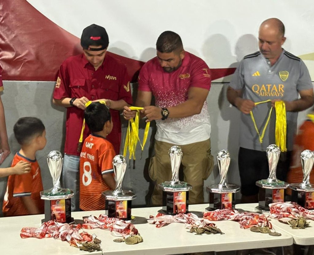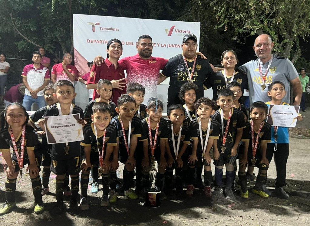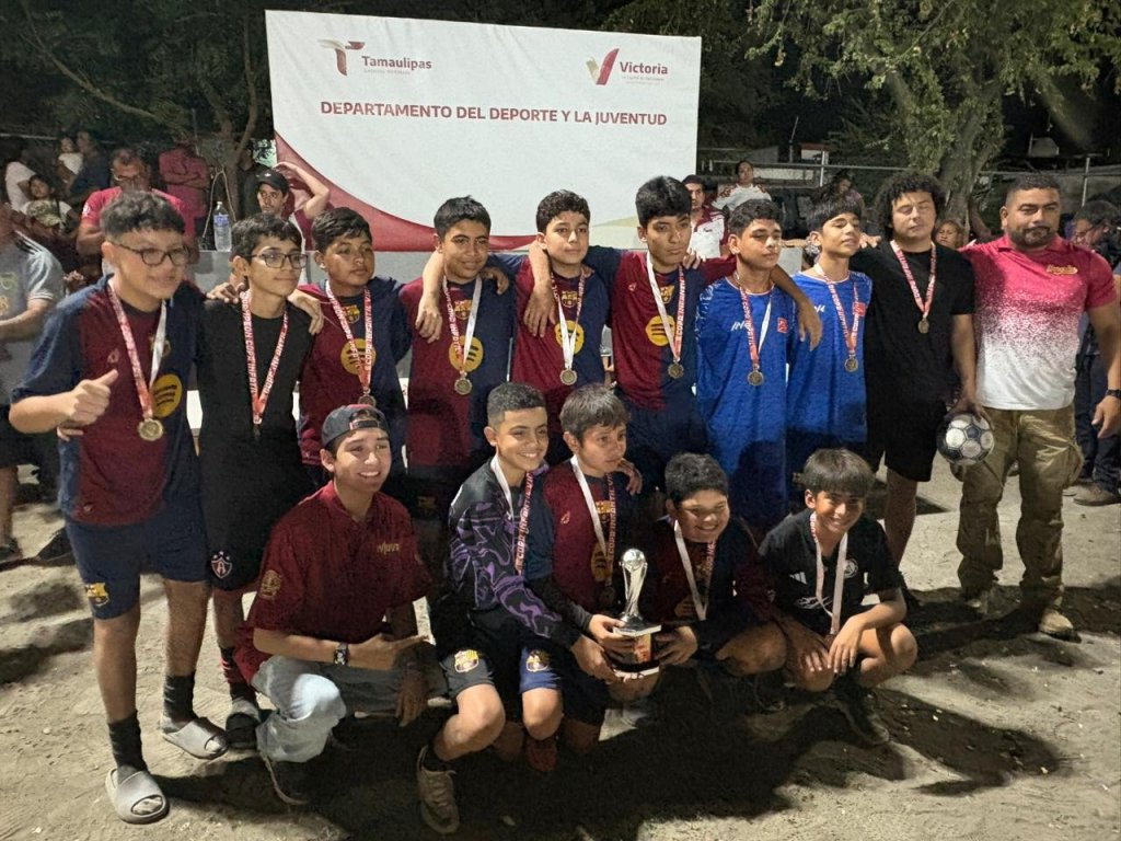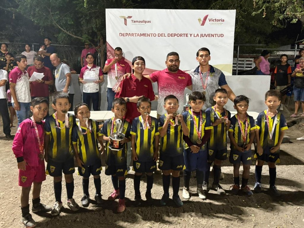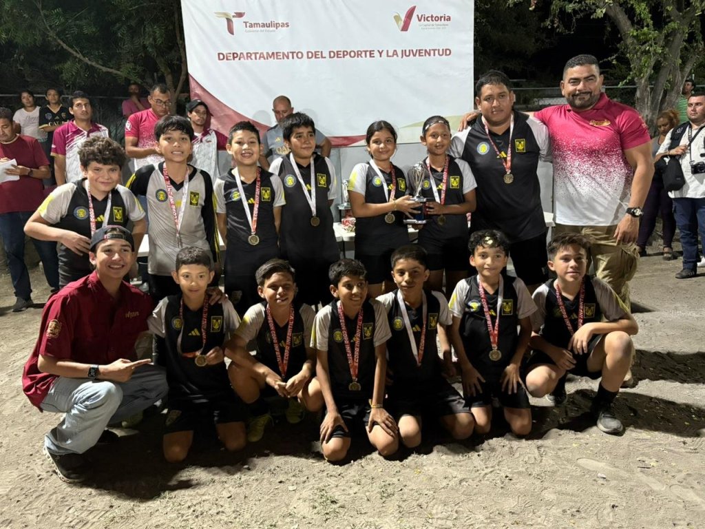 Cd. Victoria, mayo de 2025. – En representación del alcalde Eduardo Abraham Gattás Báez, el Delegado del Instituto Victorense de la Juventud (IVJUVE), Abraham Gattás Rodríguez y Carlos Pizaña jefe del Deporte local, encabezaron la premiación a los campeones de la primera edición del torneo de fútbol infantil y juvenil Copa Victoria Municipal 2025.