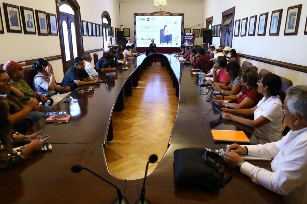 Sobre la competencia de esta herramienta digital empleados municipales y personal de la FGJE reunidos en la Sala de Cabildo, intercambiaron información sobre la eficiencia y alcance del nuevo sistema de justicia para denuncia del delito en la lucha contra la impunidad.