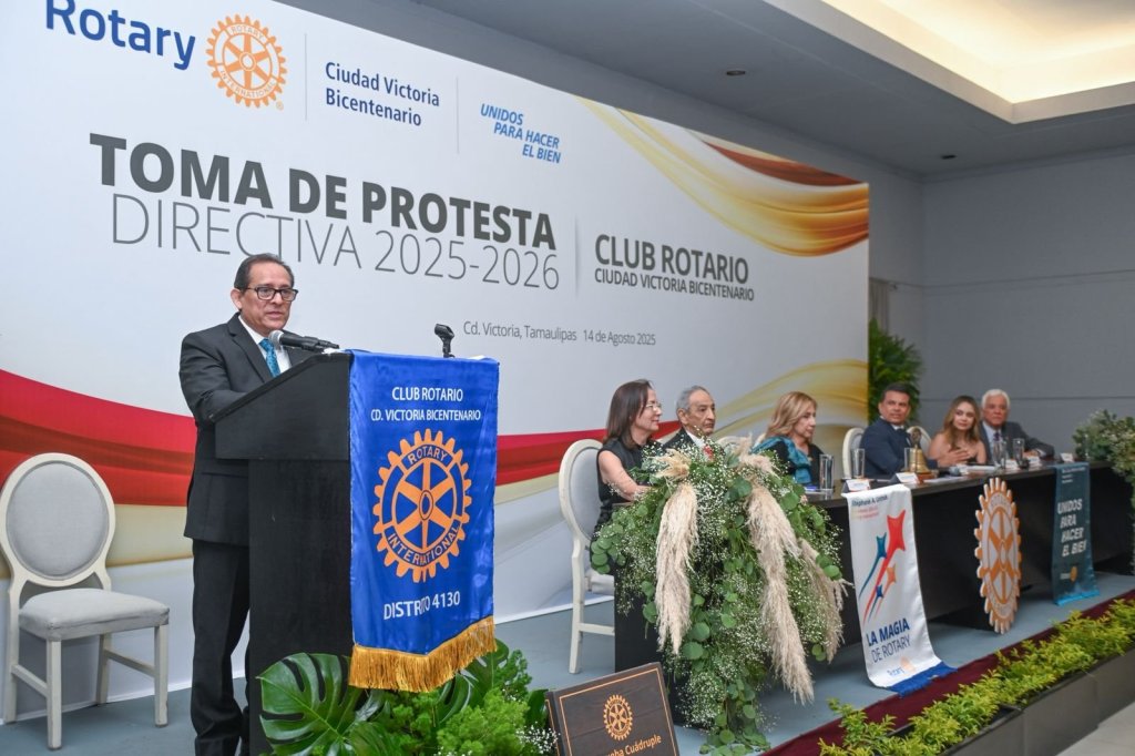 Ante Enrique Garza Tamez, representante del gobernador Américo Villarreal Anaya, felicitó y reiteró su apoyo a Margid Antonio Rodríguez Avendaño, quién tomó protesta como presidente electo del Club Rotario Ciudad Victoria Bicentenario para el periodo 2025 – 2026.