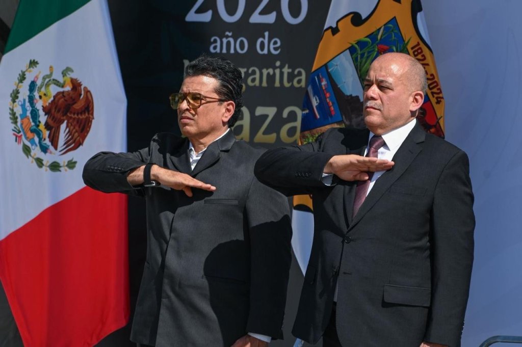 Desde el presídium, atestiguó el mensaje virtual de la presidenta Claudia Sheinbaum Pardo que dió desde el Campo Marte de la Ciudad de México, en el que afirmó que la bandera mexicana es un símbolo que une el pasado indígena, la lucha independentista y reconstrucción republicana en una imagen.